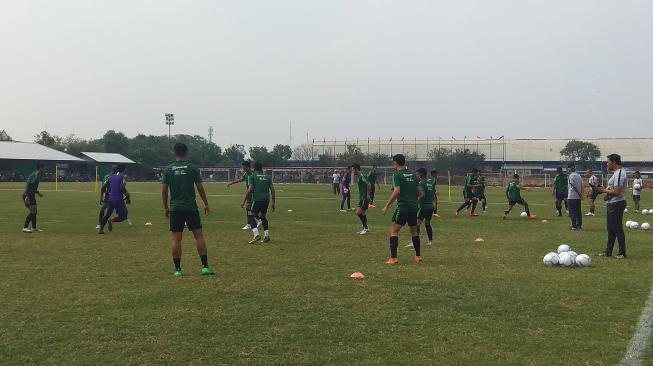 Suara.com - Timnas Indonesia masih tanpa pelatih asal Spanyol, Luis Milla, saat menjalani latihan di Lapangan Babek, Cilincing, Jakarta Utara, Minggu (9/9/2018). Boaz Solossa dan kolega hanya dilatih oleh asisten pelatih Bima Sakti dan Danurwindo.