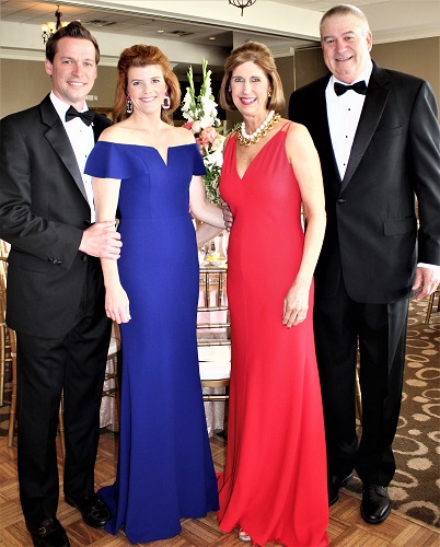 "No Show Duck Ball" Chair Lindsey Jennings (blue dress) with husband Thomas, and Charity Circle President Anne Davis (red dress) with husband Jeff at the 2019 Duck Ball