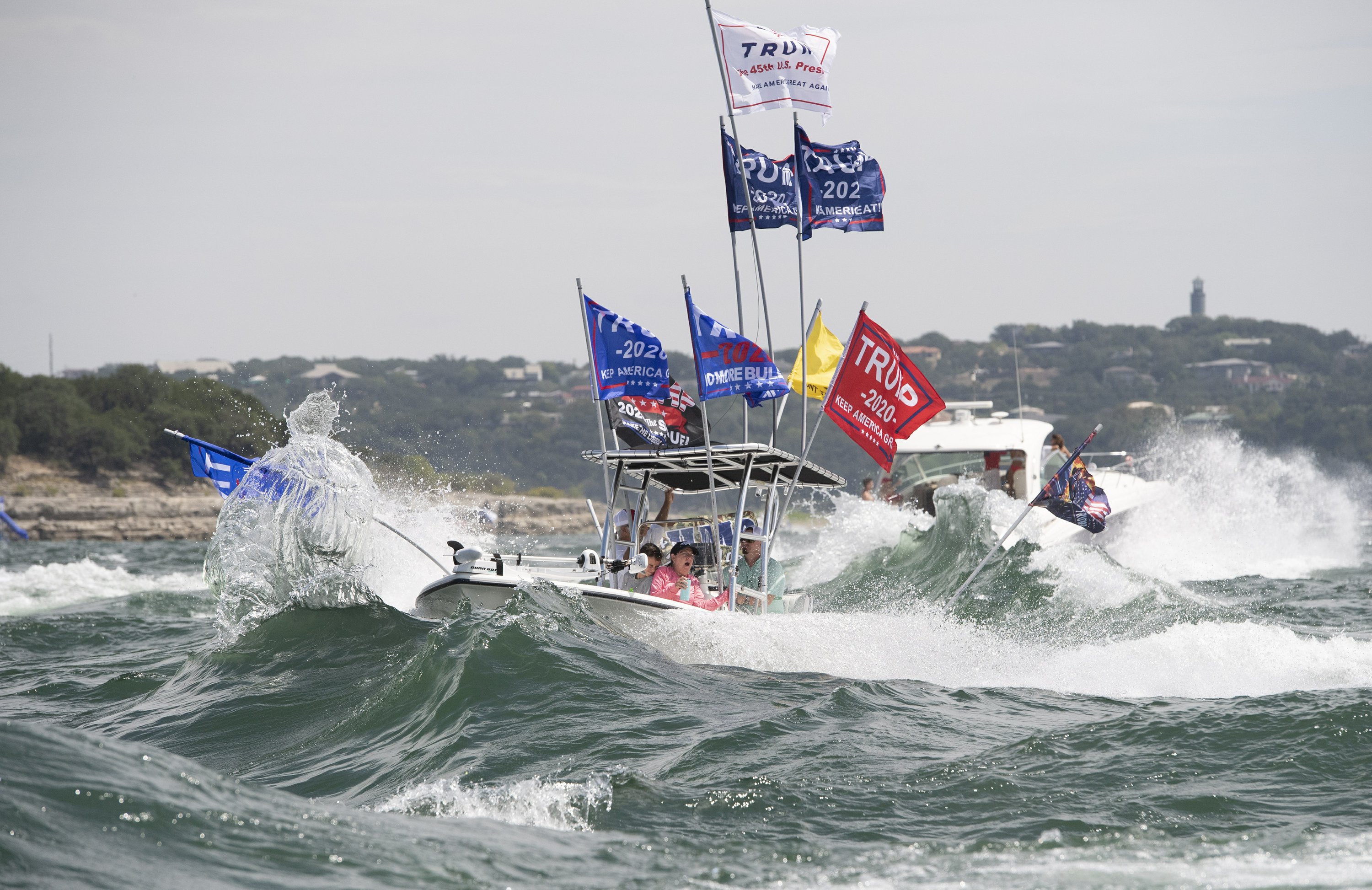 Images of the event show the water of Lake Travis choppy with the wakes of dozens of boats flying American, Texas and “Trump 2020” flags.