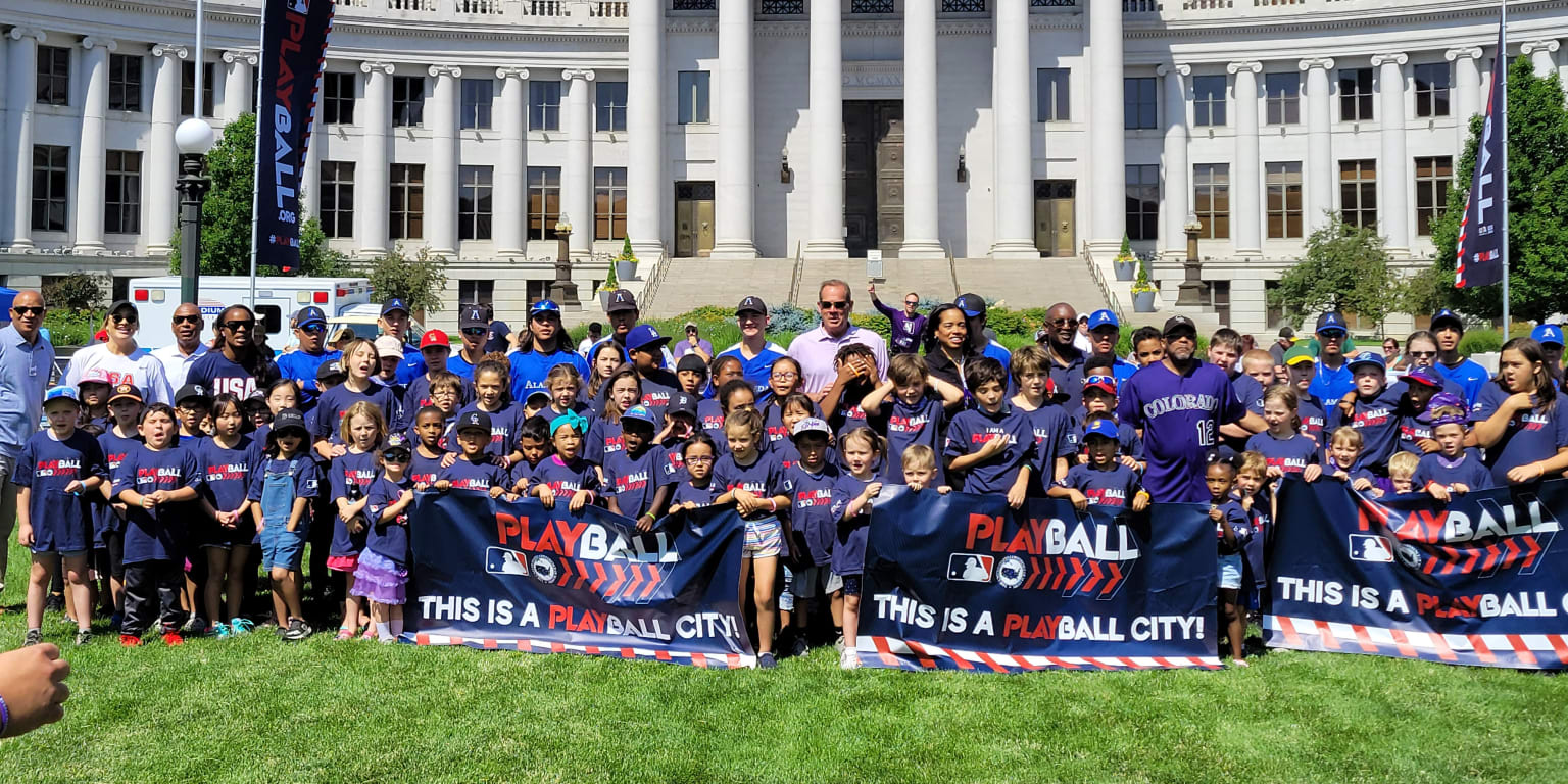 Denver Mayor Michael B. Hancock was joined by Rockies owner/chairman and CEO Dick Monfort and MLB chief baseball development officer Tony Reagins to launch the program, featuring kids participating in a series of fun-focused, informal baseball- and softball-centered activities.